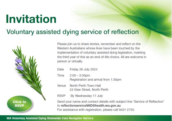 Practitioners are invited to attend the 2024 Service of Reflection on Friday 26 July to mark the third year of voluntary assisted dying as an end of life choice. Please feel free to pass the invitation on to patients, families, carers and other healthcare workers.
